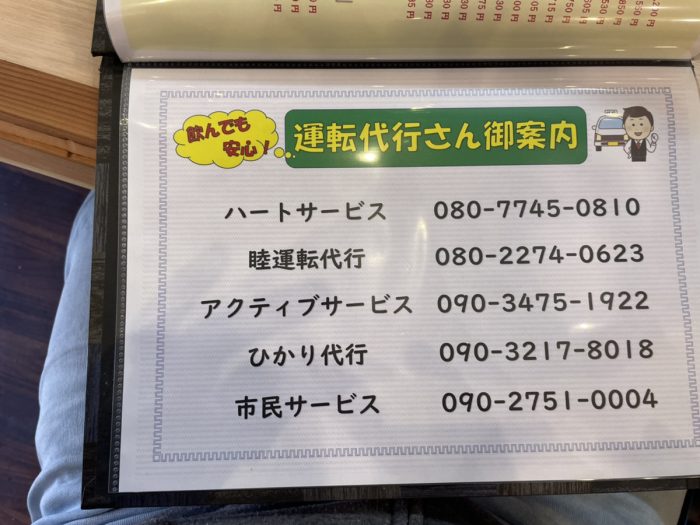 最後のぺージにはしっかり代行の連絡先まで用意されていて、安心してお酒を頼むこともできますね!