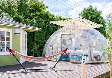 WILD BEACHオリジナルデザインの透明ドームは、今年度のリニューアルで冷暖房完備に! どんな季節も快適に、周りの景観との一体感を楽しめると好評です。